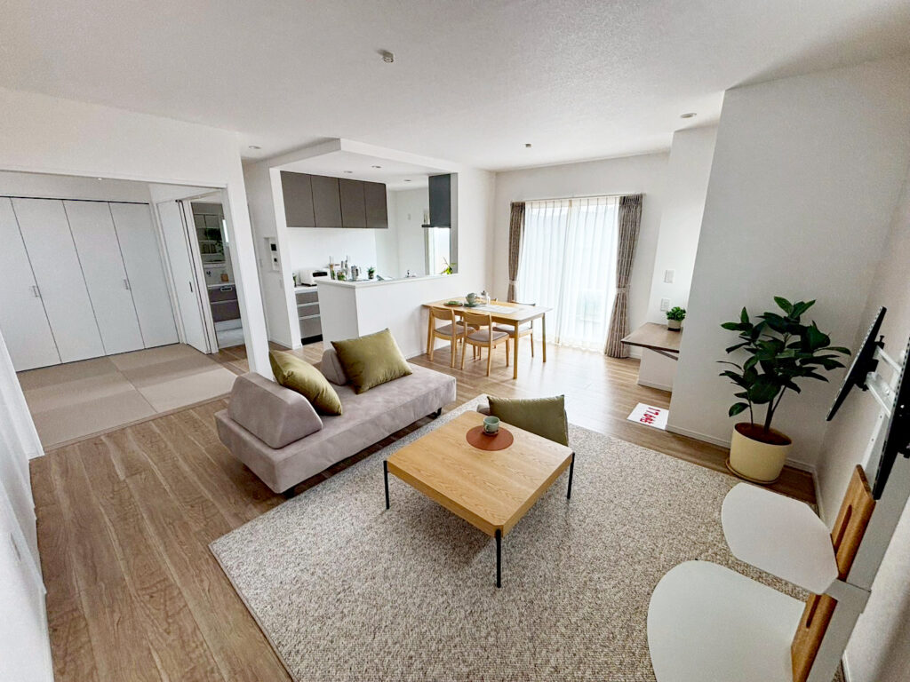解放感いっぱいの角地の9号棟にダイニングセットやソファなどを配置しました!生活のイメージが湧きますので、ぜひ一度ご覧になっていただきたいです!内覧ご希望の方はお気軽に東広島営業所までご連絡ください。