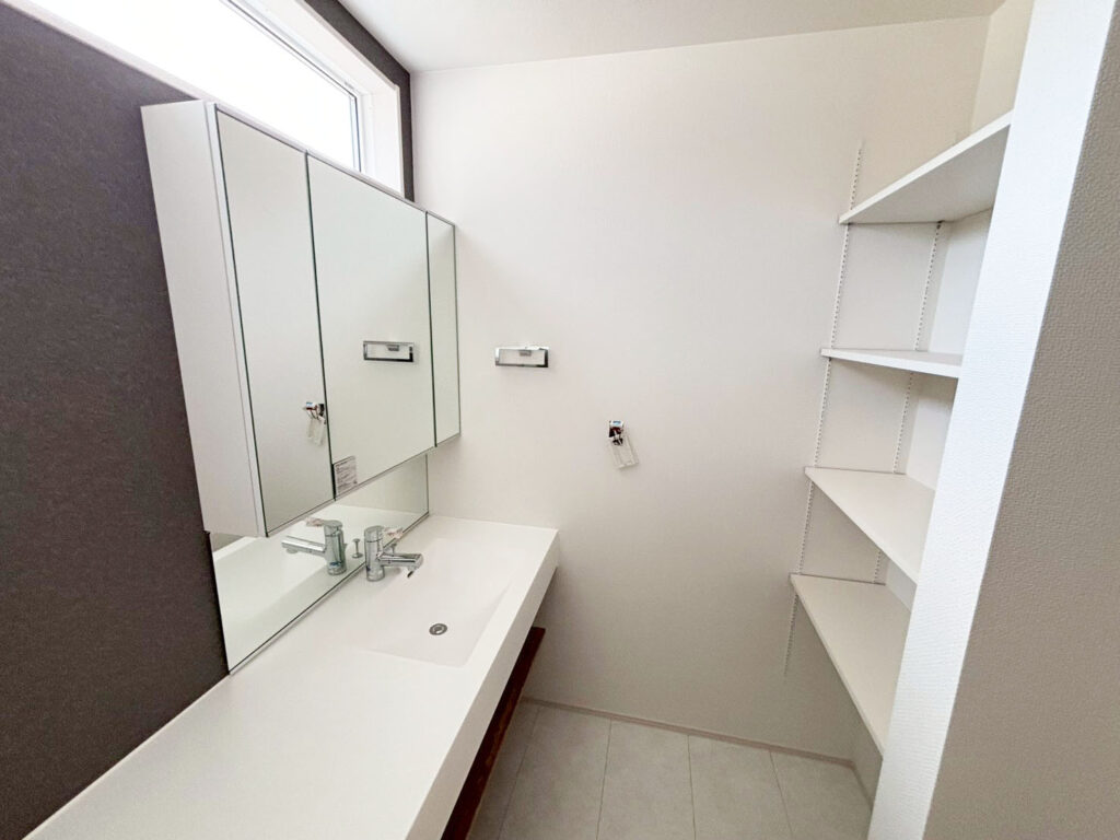 洗面室は高窓が明るさを保ちカウンター式の洗面台でお化粧もバッチリ!収納棚もあるのでとっても快適な空間となっています!お安くなったこの機会にご見学してみませんか?ご希望の方はお気軽に東広島営業所までご連絡ください。